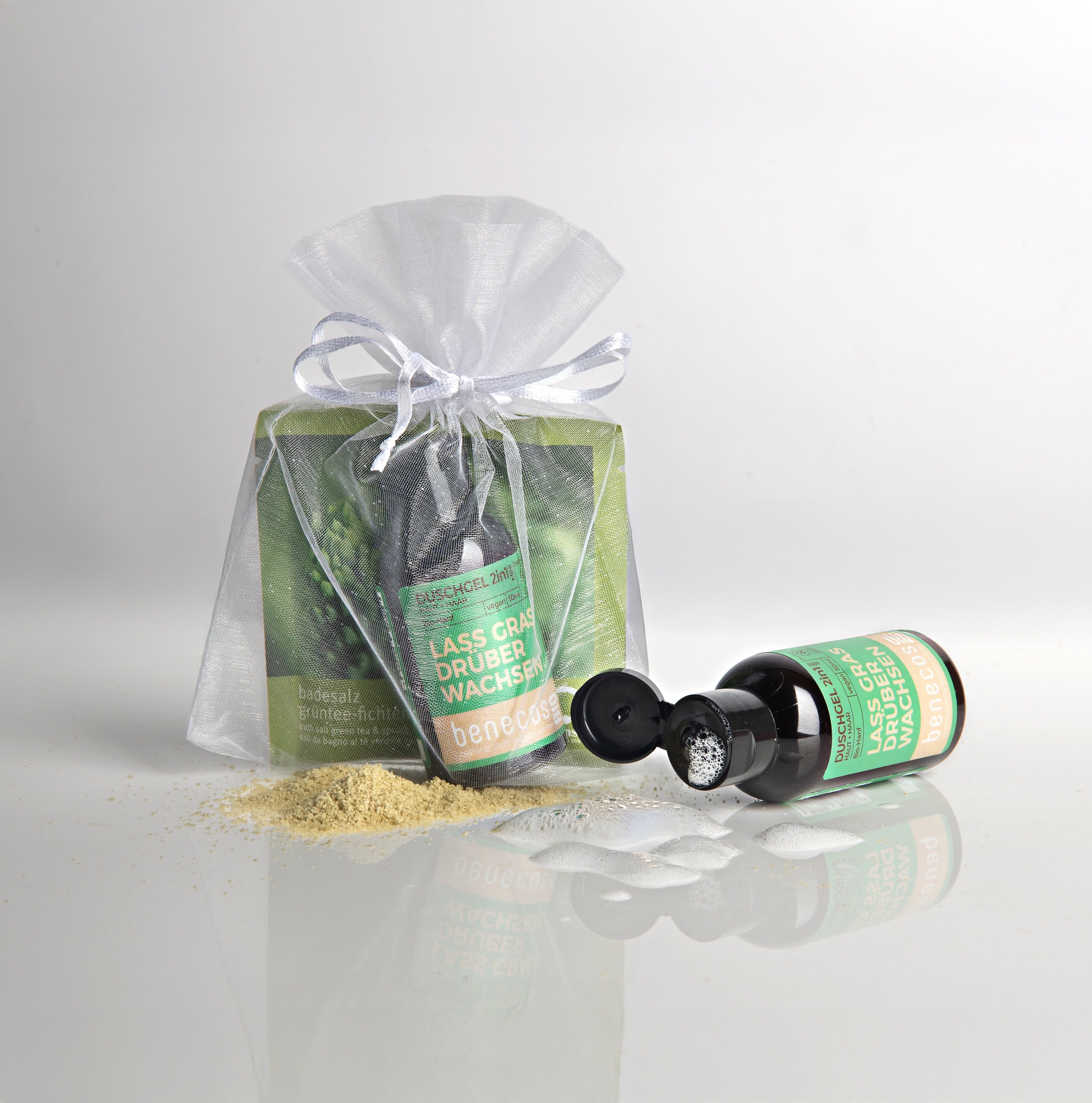 Unser Geschenkset kleine Auszeit lädt zum Entspannen ein. Ein elegantes Säckchen gefüllt mit Bio Duschgel - leicht herber Duft für Sie und Ihn 50ml und Bio Badesalz mit Grüntee-Fichtennadeln 30g.