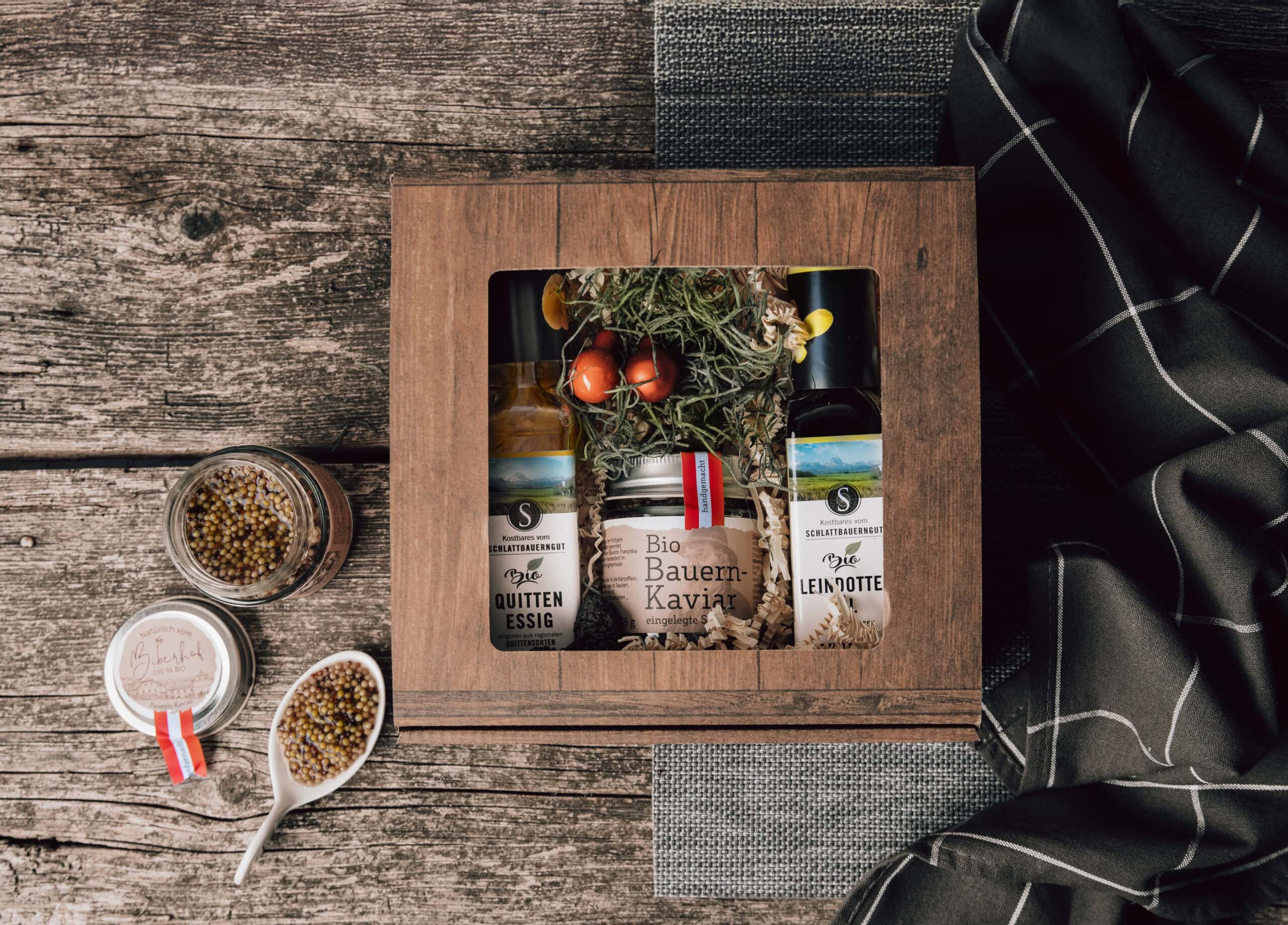 Unsere Schlemmerbox in Holzoptik ist gefüllt mit Bio Leindotteröl 100ml, Bio Quittenessig 100ml und Bio Bauernkavier 135g- Senfkörner in Essig-Honig Marinade.